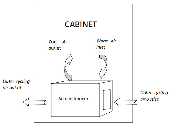 The fan in the internal cycle air path absorbs the hot air from the upside to make air heat exchange by evaporator fins, and sends the cooled air from the downside of the air conditioner. By so, the air in cabinet can cycle to achieve the purpose of lowering the temperature. Meanwhile, The fan in the external cycle air path absorbs the external cold air from the downside, and discharges the hot air from the upside after heat exchange.